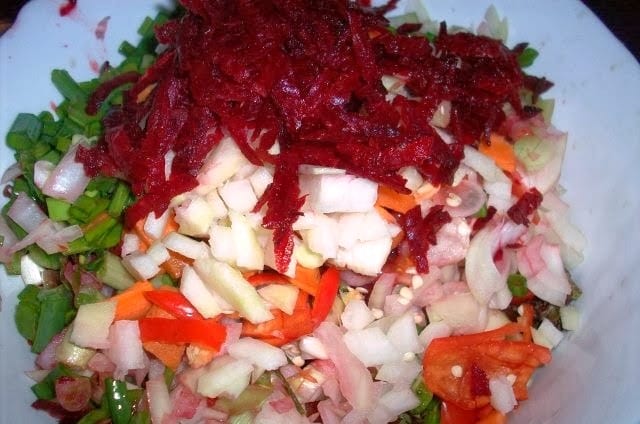 Ingrediente ♦ 3 cartofi de mărime mijlocie ♦ 1 gulie ♦ 2 morcovi ♦ 1 ţelină mijlocie ♦ 300 g fasole păstăi ♦ 1 sfeclă roşie ♦ 100 g mazăre boabe (sau din conservă) ♦ 2 linguri pătrunjel, mărar, busuioc, tăiate fin şi amestecate ♦ sare, după gust Sosul ♦ 2 cepe ♦ 2 ardei… continuați să citiți