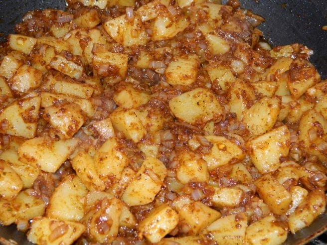 750 g cartofi, 2-3 cepe mari, 3-4 linguri untură, sare piper.