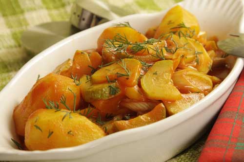 4 dovlecei potrivit de mari, 4-5 cartofi, 1 lingură untură, 1 lingură unt, 1 ceaşcă smântână, 1 lingură făină, mărar, sare.