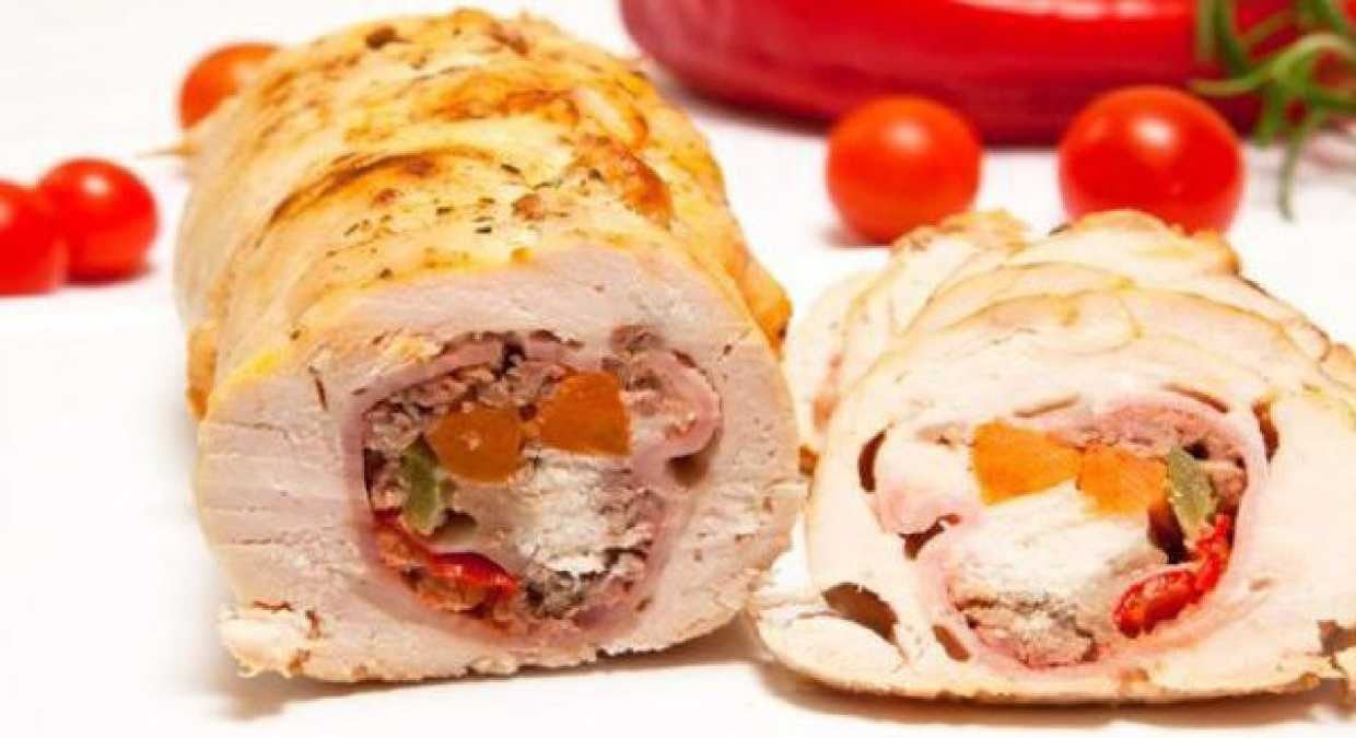 1piept mare de pui, 3 felii de caşcaval, 2 felii de şuncă, 50 g carne tocată de porc, 1/2 ceapă roşie, 1/2 ardei roşu, 1/2 ardei verde, 1 morcov fiert, sare, piper, boia dulce, cimbru, 50 g vin alb, 2 linguri ulei de măsline. continuați să citiți