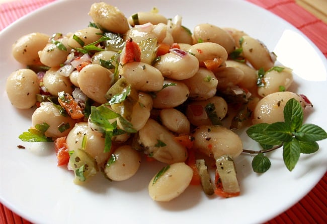 2 căni fasole albă fiartă, 1 ţelină mică, 1 ceapa roşie, 1 ar verde 2-3 roşii coapte bine, 2 căţei de usturoi, 2 linguri zeamă de lămâie, sare, 3 linguri ulei de măsline, 25 g stafide. continuați să citiți