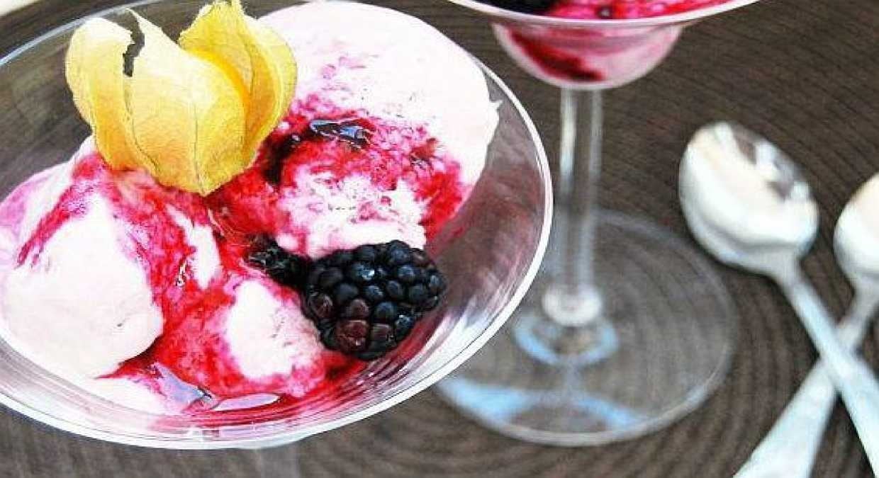 Puneţi murele şi sucul de mere într-o oală mică, aduceţi la fierbere şi lăsaţi-o la foc mic pentru 3 minute. Amestecaţi din când în când. Adăugaţi zahărul, amestecaţi până se dizolvă, aduceţi la fierbere şi lăsaţi pentru 2 minute amestecând, până se formează un sirop puţin gros. Lăsaţi să se răcească, apoi luaţi 3 linguri de sos şi puneţi deoparte pentru decor. Daţi sosul rămas la robot până formează un piure şi strecuraţi pentru a elimina bobiţele murelor. Mixaţi smântâna lichidă până formează moaţe, adăugaţi laptele condensat şi esenţa de vanilie şi bateţi bine până se întăreşte. Puneţi crema într-un vas rezistent la frigider, adăugaţi deasupra pireul şi amestecaţi cu o spatulă în forme de 8 până apar fâşii asimetrice. Acoperiţi şi daţi la congelator pentru cel puţin 3 ore. Serviţi în cupe cu sirop deasupra.