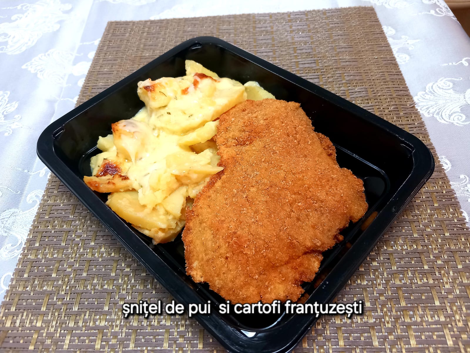 Prima pagină / Meniul Săptămânii / Joi / Fel Principal & Garnitură / Snitel crocant de pui si cartofi la cuptor cu telemea