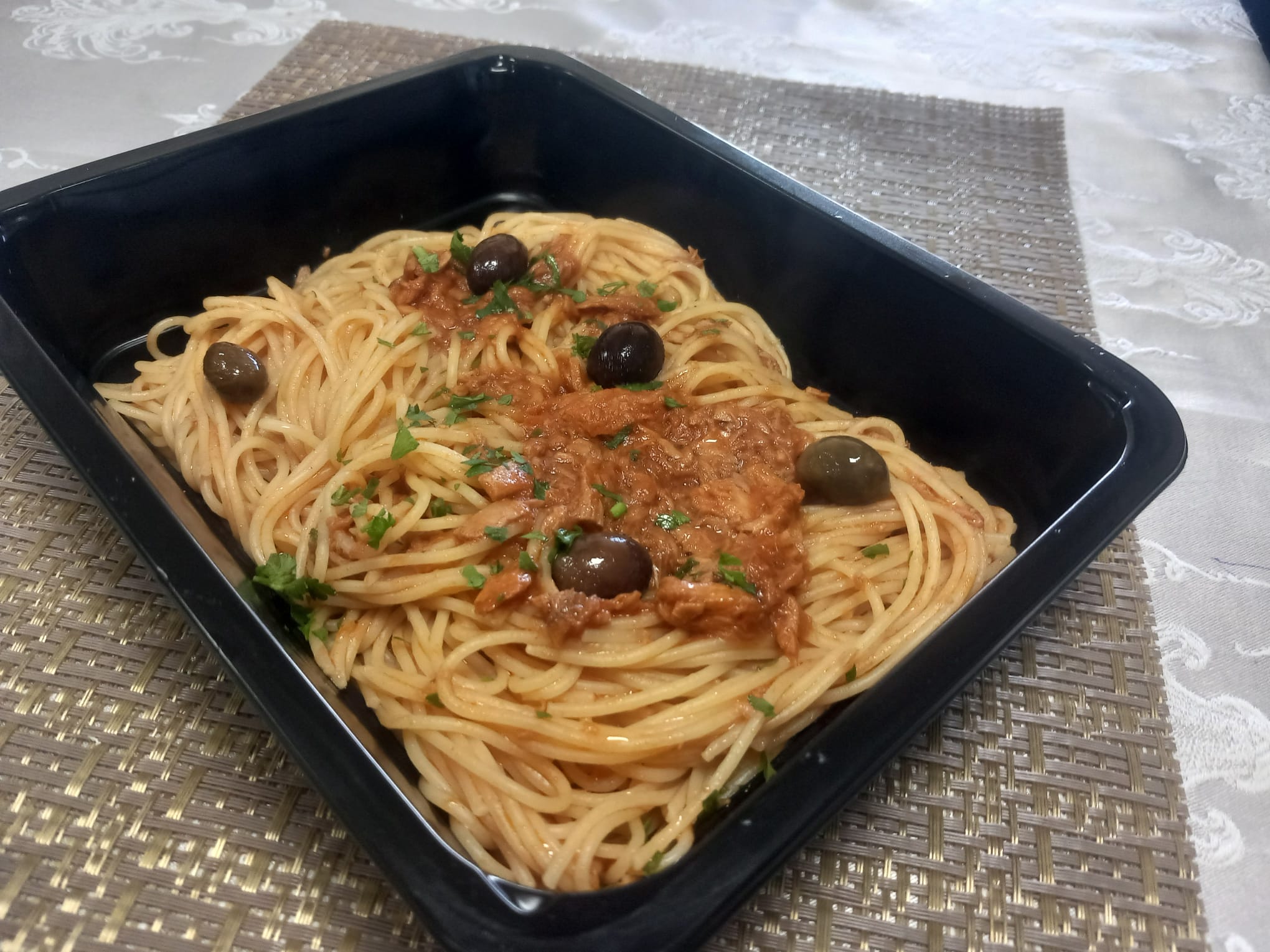 Ingrediente: paste, ton peste, rosii , condimente, verdeata – 450grame