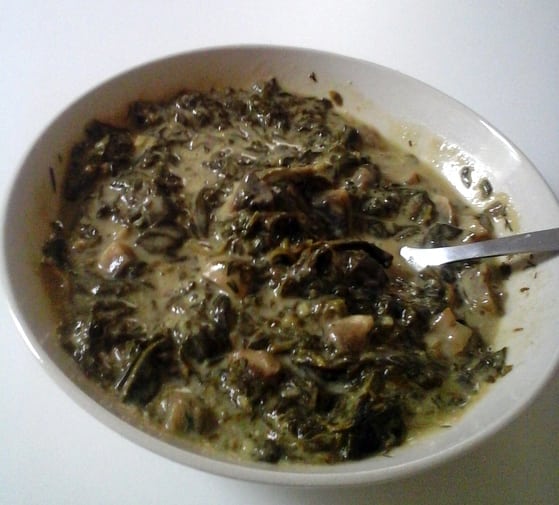 Într-o ctatiţă se pun spanacul pasat, se adaugă usturoiul şi ceapa Se pune cratiţi la foc mic (atenţje, sare!). Într-un castron mic amestecăm făina cu sucul de roşii şi laptele (se poate doar lapte), turnăm peste spanac, amestecând continuu, şi adăugăm şi vegeta, eventual sare la nevoie. Fierbem 5 minute. Este gata, punem capacul. Mâncarea se serveşte cu chifteluţe, drob sau cu un ou fiert moale pentru fiecare porţie.