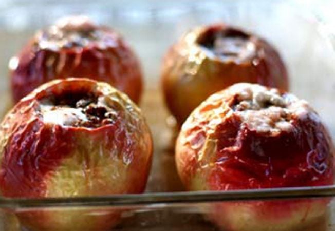 Merele se spală, şi cu un dispozitiv special li se îndepărtează cotorul. Se taie pe jumătate şi se pun în tava de la aragaz, în care s-a pus o hârtie pentru copt. Merele se pun în rânduri, cu gura tăiată în sus. Se dau la cuptor şi se coc la foc potrivit. înainte de a fi servite, se aromează cu miere şi migdale măcinate.