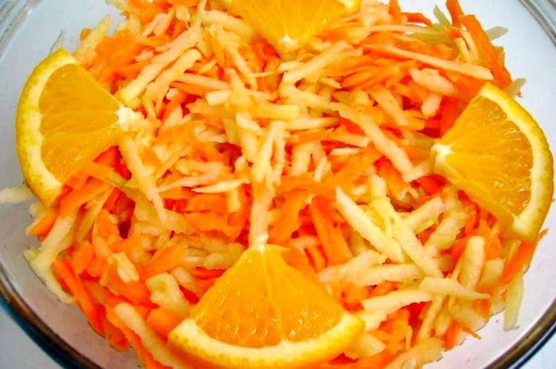 Se curăţă morcovul şi ţelina, se taie ca tăiţeii, se aşază în salatieră, se adaugă castraveţii tăiaţi felii subţiri, un măr tăiat felii subţiri, roşiile curăţate de pieliţă şi seminţe şi tăiate felii, prunele spălate şi tăiate felii sau vişinele fără sâmburi.