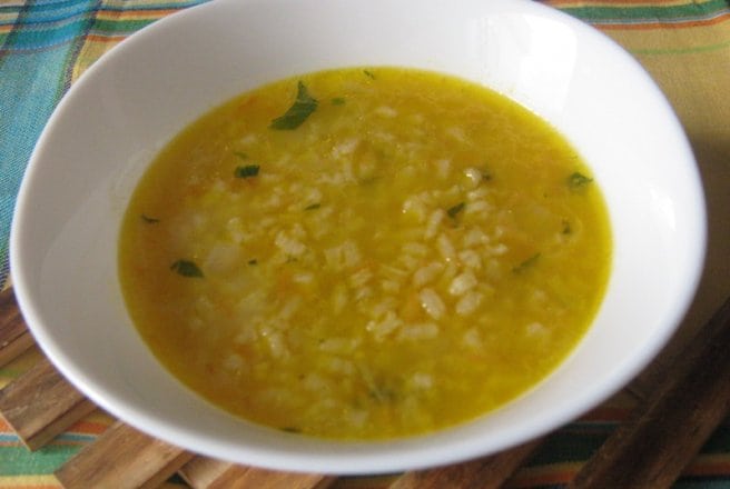 Supă de carne de vacă sau de pasăre, pentru fiecare persoană 1/2 lingură orez.